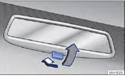 O antiofuscamento automático pode ser ligado e desligado com o interruptor no espelho retrovisor interno → Fig. 69 2 . Com o antiofuscamento automático ligado, a luz de controle → Fig. 69 1 se acende.